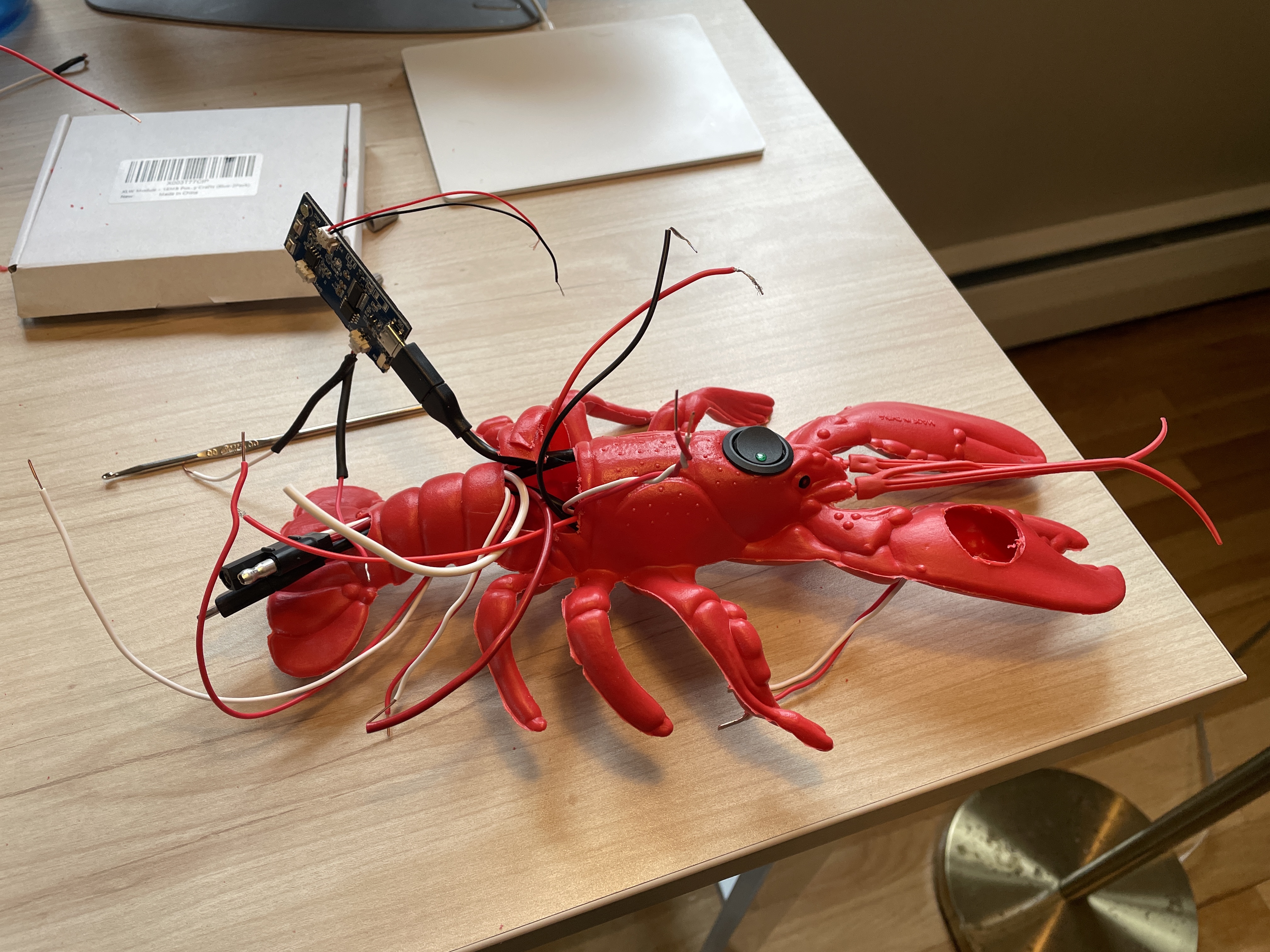 It ended up taking a bit more trial and error than I anticipated to get the PVC frame right, but it ultimately wasn't too painful. Mounting the float switches on two caps that went through the frame to the lobster's mount point wasn't bad either. What did suck, however, was installing all of the electronics inside the lobster. I put the speaker in the right claw, the switch on the head, and the USB-C cord going out of the tail, but the body cavity was a little smaller than ideal, and it took a lot of really careful finagling (and honestly a lot of just crossing my fingers that I wouldn't break a component or connection in the process) to get all of the wiring into the lobster. I did manage to get it all in, and I was almost done. Right?