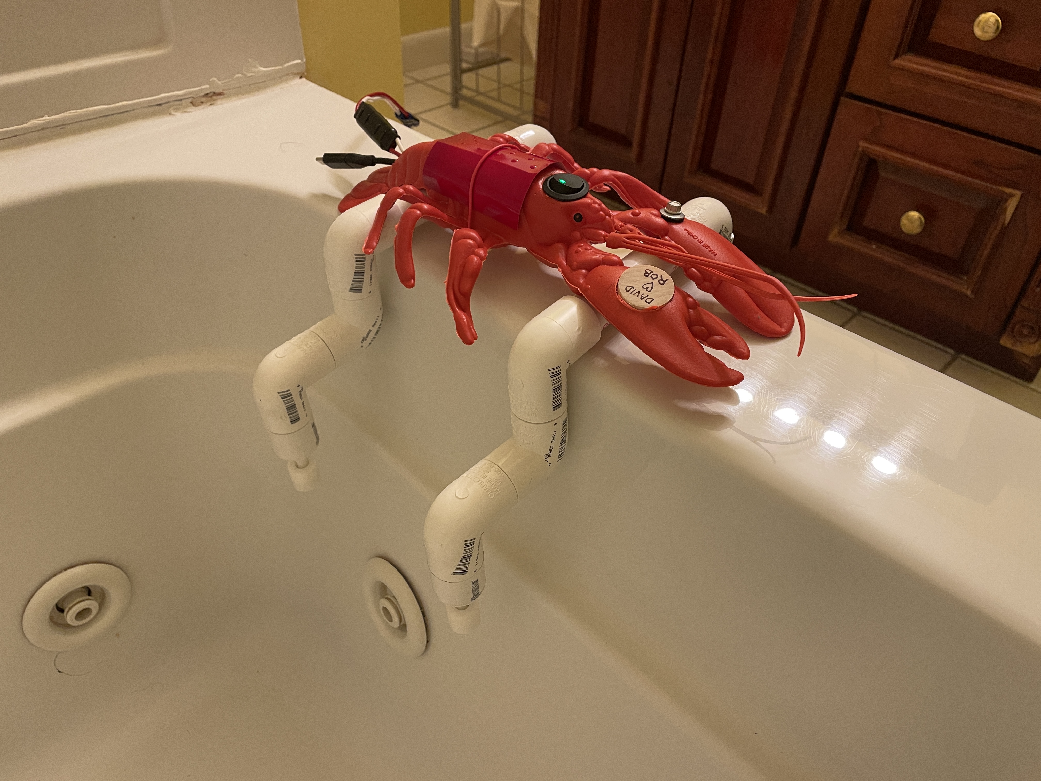 Watching Rob unwrap the lobster was priceless. He's extremely intelligent and good at figuring things out, so I asked him to take a stab at figuring out what the hell this lobster with a switch on a PVC frame was supposed to do. He immediately saw that it was supposed to connect to something and further surmised that it looked like it was supposed to mount on something. He actually gravitated into the bathroom and stared at the bathtub, but gave up on it because he couldn't see what it might possibly connect to there, all of which I was pleased with. Shortly after that, I revealed that his bathroom suspicions were correct, plunked the lobster down on the bathtub edge, and smoothly pulled out the hidden wire and connected it to the lobster.