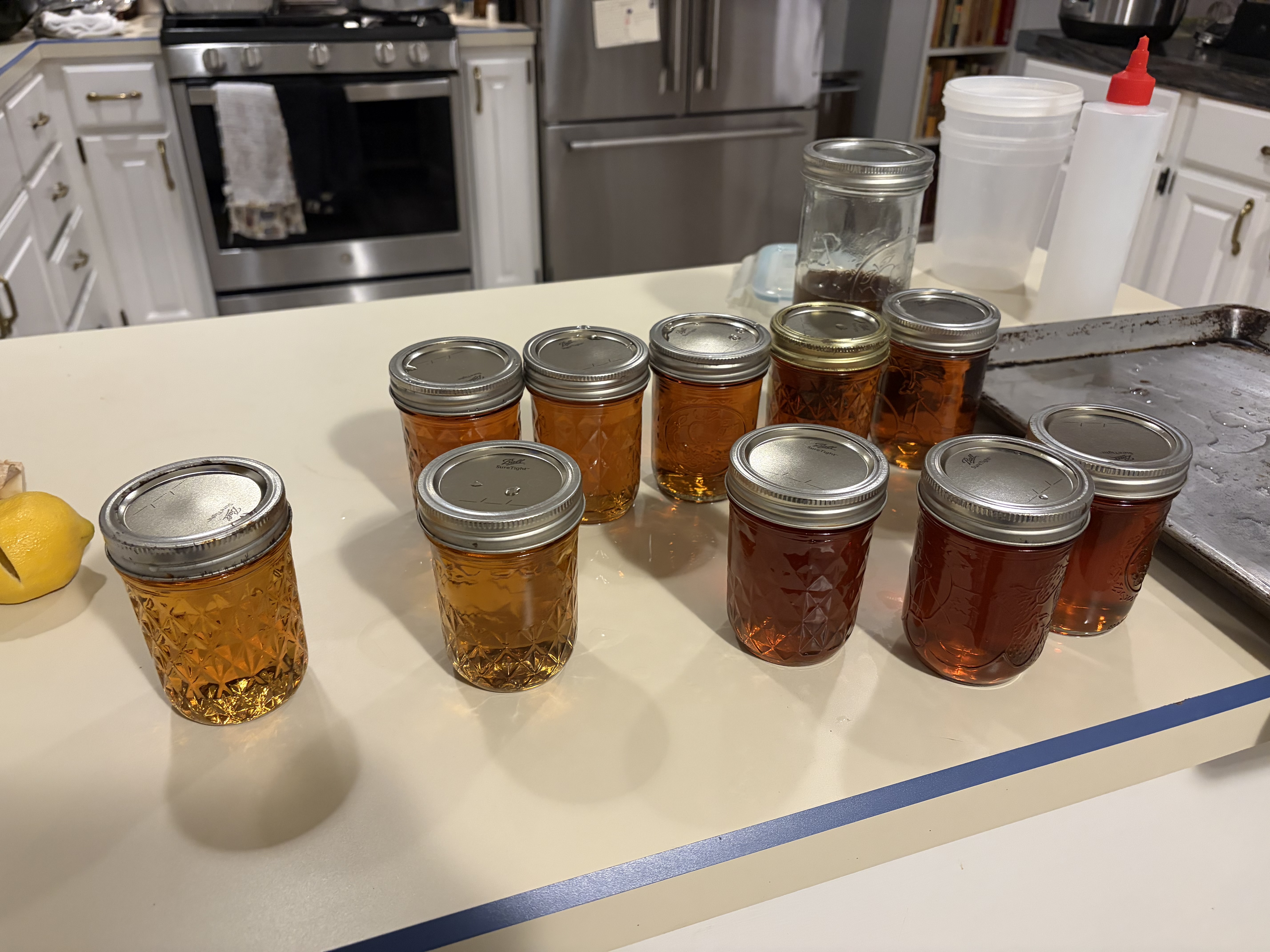 Once a batch of sap has boiled down enough, we pour it into a stockpot and finish the process inside. This part needs careful supervision, or the sap is very likely to spill over and burn and cause a nasty sticky mess all over the kitchen that takes ages to clean up - ask us how we know. Anyways, we keep boiling the sap until it reaches 219 degrees Fahrenheit; this is the point that the water content is low enough that will not spoil. Then, we let it cool down to 190, and filter it into jars. One has to wait until 190 because above this temperature, sugar sand can continue to form and cloud up the maple syrup. After the syrup is sealed tightly in jars, we put them in a sous vide bath up to 185 to ensure sterilization.