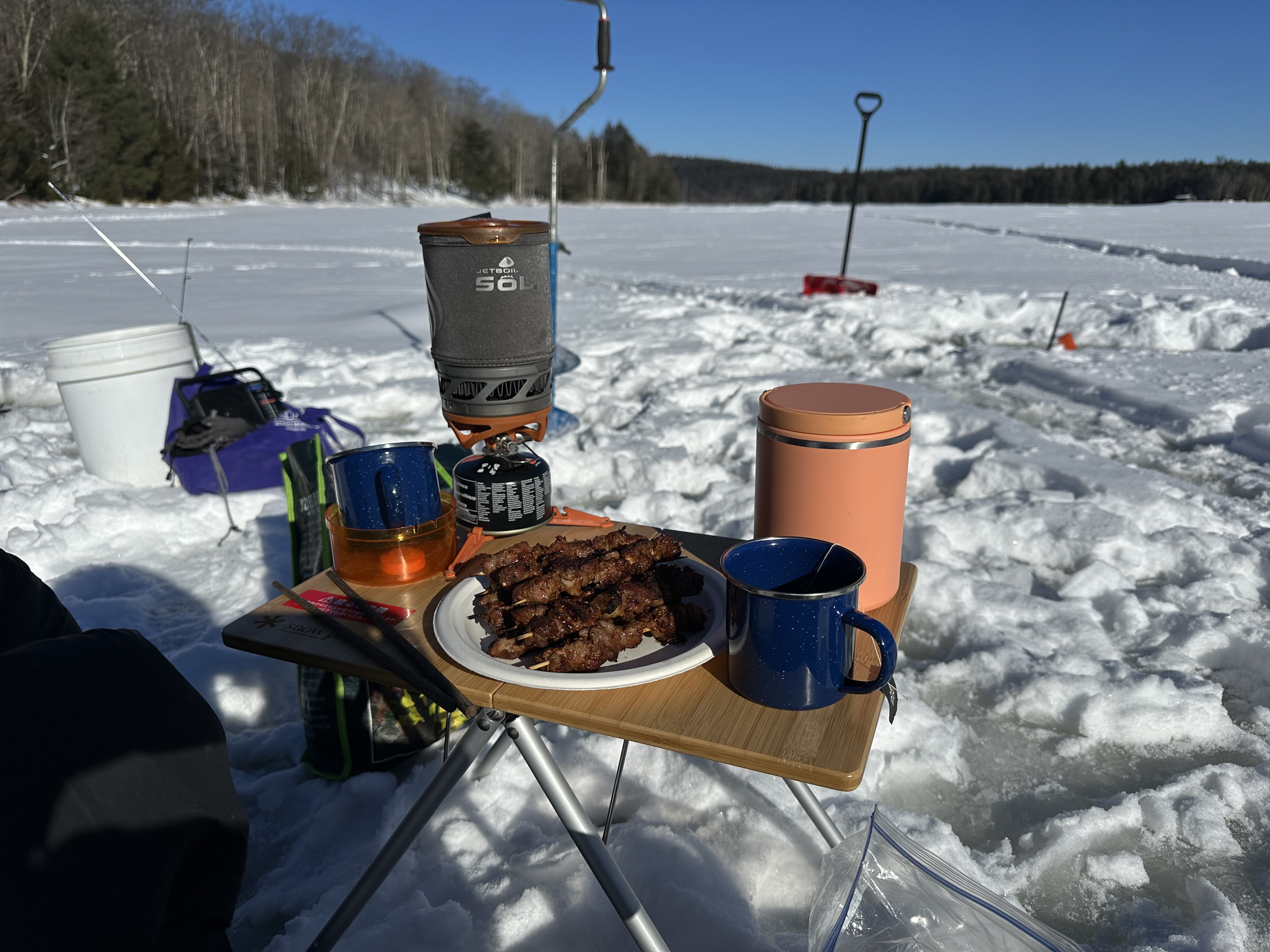 At this point, you're basically just chilling on the ice and maybe you catch a fish too. Rob always likes to do something fancy on our outdoor excursions and this time was no exception. He had skewered up some lamb beforehand and brought a little charcoal camping grill, so he got the grill going and we enjoyed some 羊肉串儿. We packed the Jetboil so we were able to have hot tea as well.