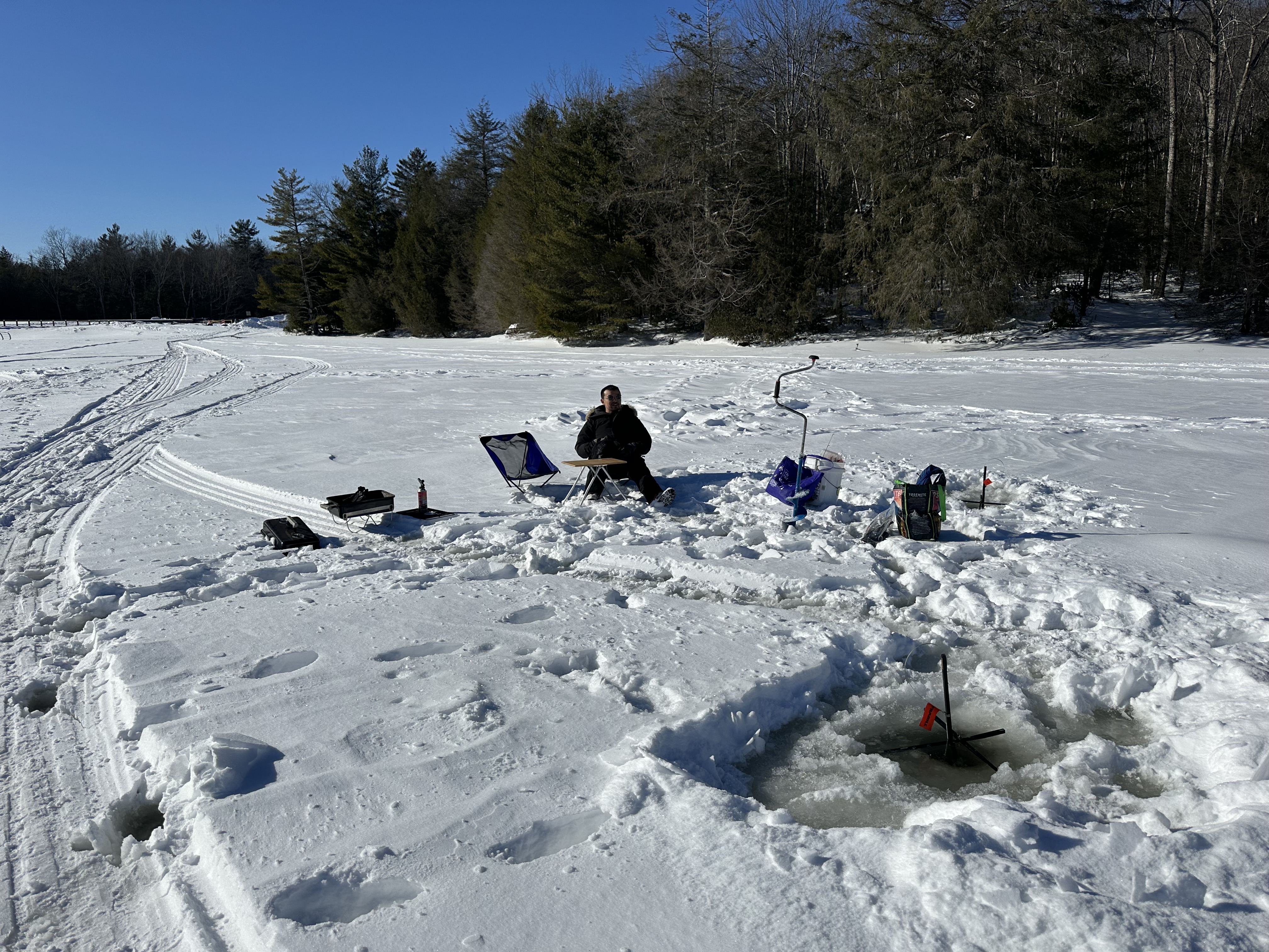It was a nice sunny day out, and we had a good time sitting there on the lake. Ultimately, none of our tip-ups tipped up, so we went home without a fish, which is how a lot of our attempts at fishing seem to go and we're totally okay with that.