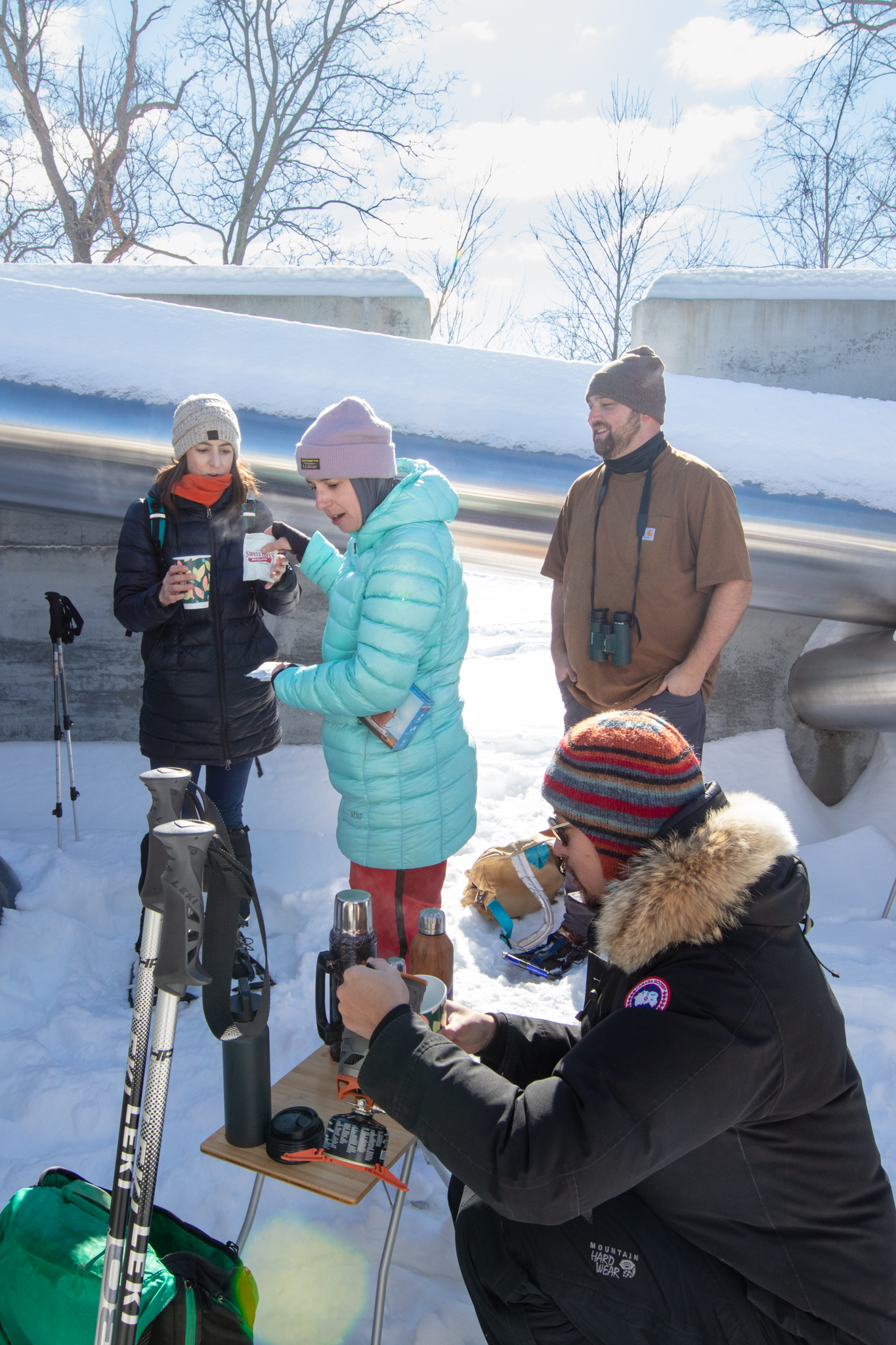 After one of the big blizzards, we met up with a group of friends at Art Omi, a sculpture park across in Columbia County. This park is nice because it's free, and stays open in the winter for people who want to snowshoe or cross-country ski around their little network of trails. Most of us including me and Rob had snowshoes. It was a gorgeous day to be out and I thought it was really cool to see all the art in such a wintery setting, since I've only been there before in other seasons. I brought along my Jetboil and other supplies necessary for a mid-snowshoe hot chocolate break in the middle of a sculpture.